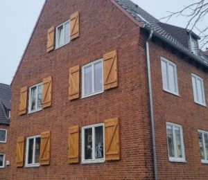 Ein besonderer Schwerpunkt lag auf der Abstimmung mit der Denkmalbehörde. Zur Straßenseite hin wurden zweiflügelige Holzfenster, teilweise mit Sprossen, eingesetzt. Auch die Fensterläden wurden von einflügeligen auf zweiflügelige Ausführungen umgestellt und tragen zusammen mit den Arbeiten am Dach und den Dachwohnfenstern zur historischen Gesamtwirkung des Hauses bei. Der Denkmalschutz wurde damit nicht nur eingehalten, sondern sichtbar aufgewertet.